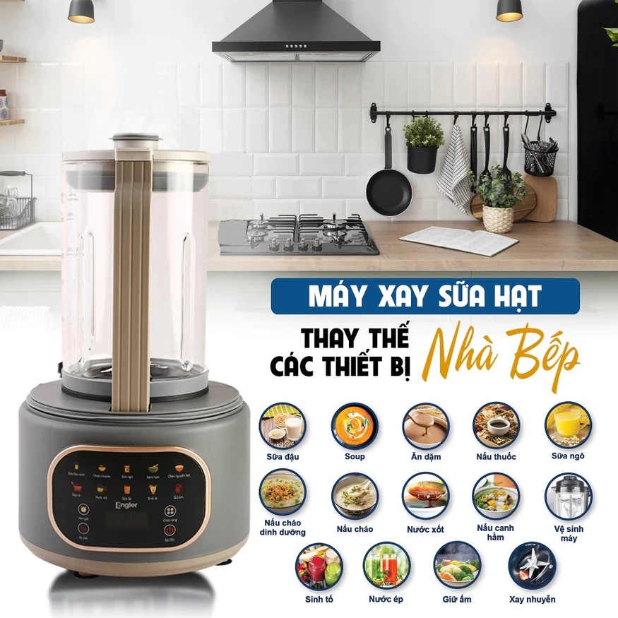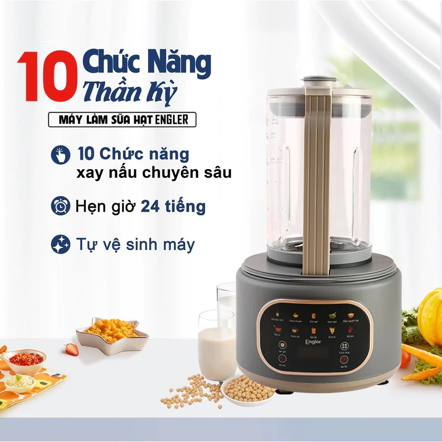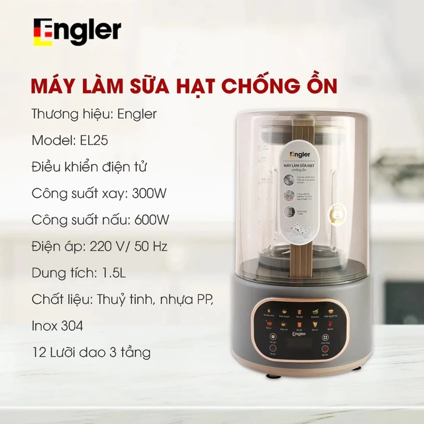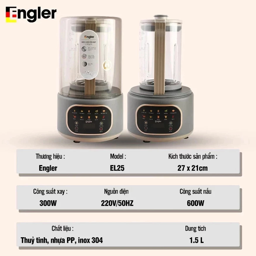 – Máy làm sữa hạt Engler EL25 có dung tích 1.5L, có 10 chức năng xay nấu và chống ồn.