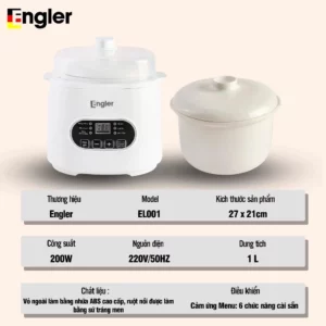 Nồi nấu cháo chậm Engler EL001 là trợ thủ đắc lực cho mẹ bỉm và gia đình có người lớn tuổi. Với công nghệ nấu chậm giữ nguyên dưỡng chất, thiết kế dễ dùng, an toàn, sản phẩm giúp nấu cháo, hấp yến, hầm canh tiện lợi và thơm ngon.