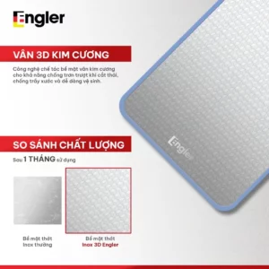 – Mặt inox 304 cao cấp, thiết kế chống tràn: Thớt ENGLER sử dụng inox 304 cao cấp với khả năng kháng khuẩn và khử mùi hôi, lý tưởng cho việc xử lý thực phẩm sống. Thiết kế thông minh chống trào giữ bề mặt làm việc sạch sẽ, giảm thiểu tình trạng nước hay dầu mỡ tràn ra ngoài, đảm bảo sự tiện lợi và an toàn trong quá trình nấu nướng.